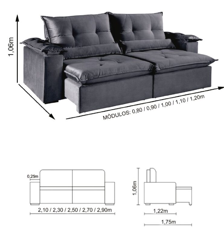 Braços: Modelo pillow com enchimento 100% em fibra siliconada, garantindo suavidade e apoio agradável. Largura padrão de 0,25 m, ideal para compor diferentes ambientes com elegância.