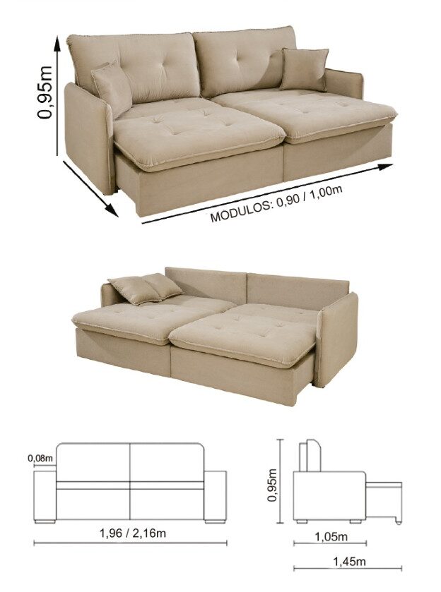 Encosto: Almofadas soltas com enchimento 100% fibra siliconada, proporcionando conforto e flexibilidade para ajuste.