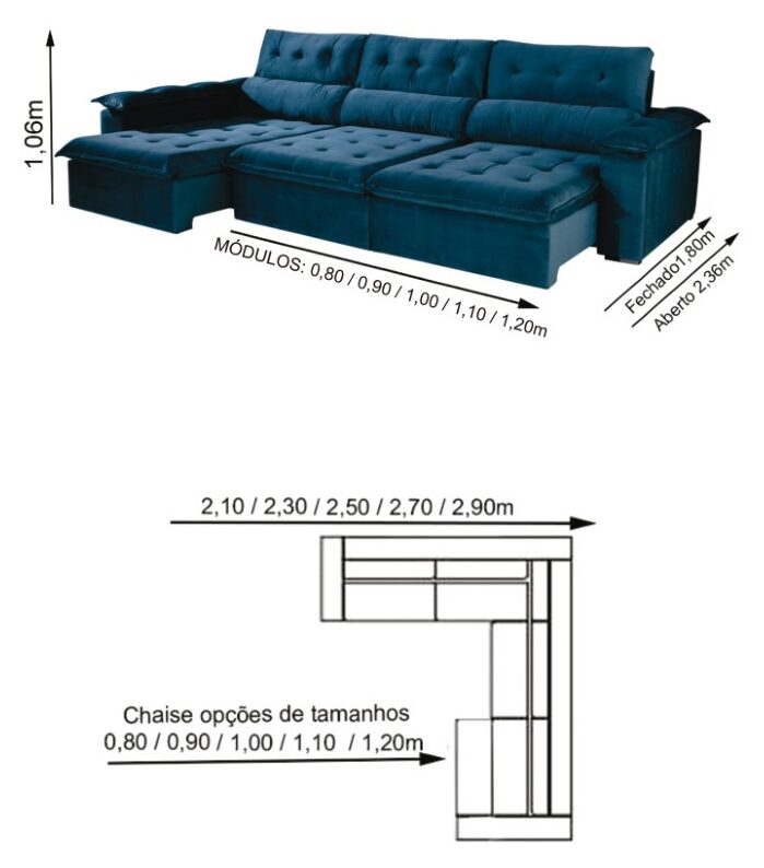 Braços: Estilo pillow com enchimento 100% em fibra siliconada. Largura padrão de 0,25 m, proporcionando equilíbrio entre estética e conforto. Chaise retrátil integrada, ideal para momentos de relaxamento.
