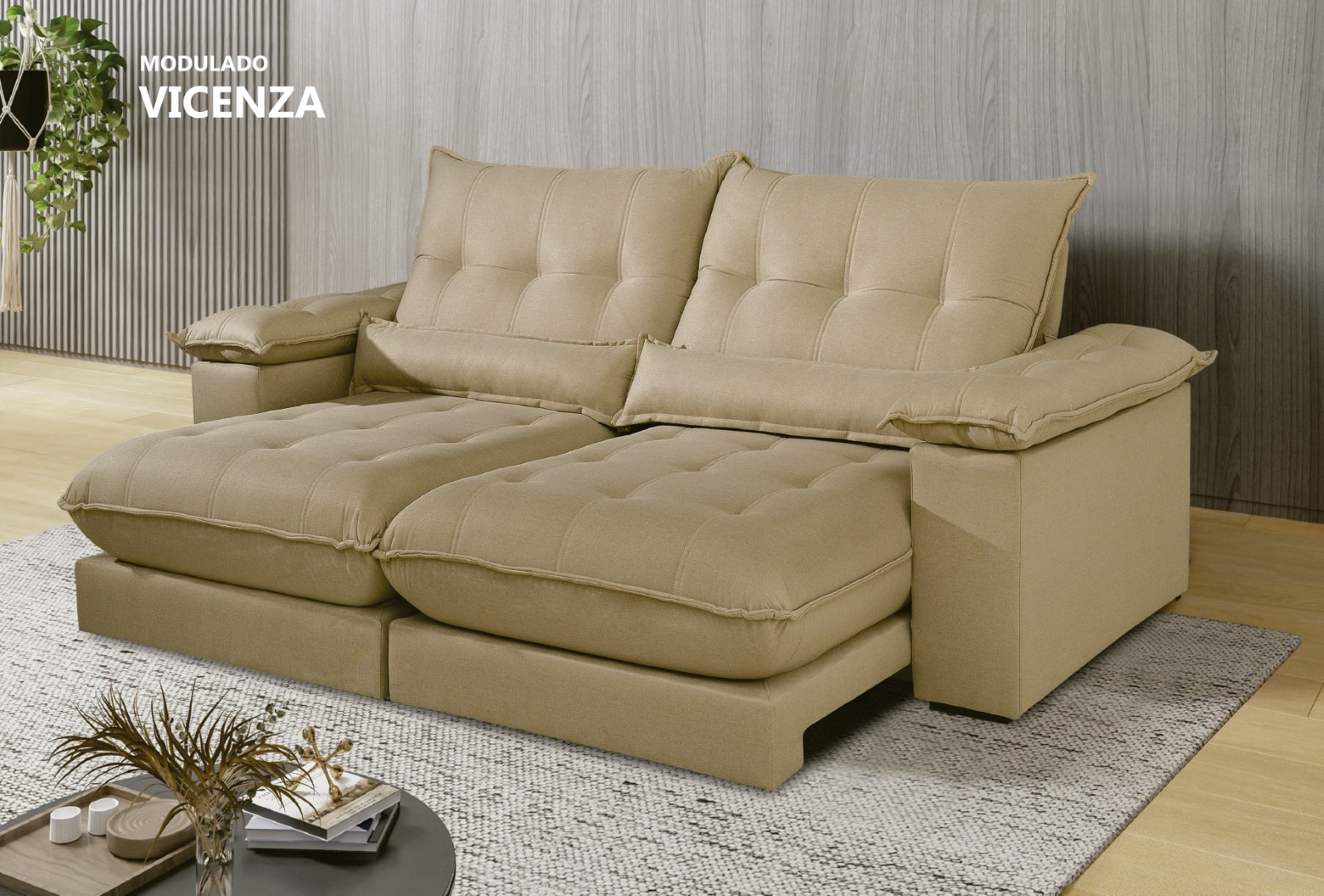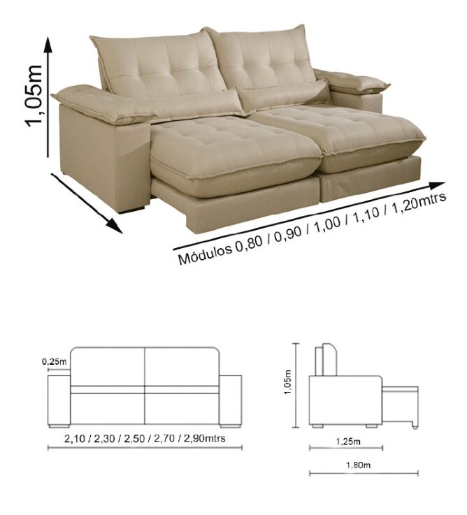 Braços: Estofamento tipo pillow com enchimento 100% em fibra siliconada. Largura padrão de 0,25 m, ideal para conforto e otimização do espaço.